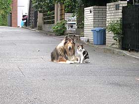 ライフさん(顧客)へ行く途中の住宅街の道路上に、犬と猫(?)が並んでいるように見えたので、経路を変え近づくと、写真の通り仲良く座っていた。ほとんど車は通らないと思われるが、車道の真ん中を占領している。たぶん、同じ家で飼われているのだろうが、珍しい光景だとカメラを取り出すと「怪しい奴だ」と警戒されたが、撮影できた。横を通り過ぎたところ猫が写真右の家へ入っていった。 その後、たまにこの道を通るが、暑くなったこともあり犬と猫も見ない。 |