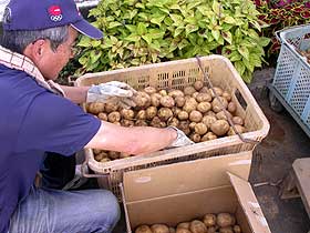 まったく手伝いをする予定ではなかったが、手伝いに行く人が道に迷ったということで、ジャガイモ畑へ案内そのまま出荷の手伝いを17時までやった。イモ堀は終わっていたが、これからが大仕事ということであったが、ほとんど手伝いの人たちは帰ってしましった。仕事はイモを選別して、20kgの箱詰め作業である。梅雨明けしたのだろう、日差しが強すぎて、半袖でだったため帰宅して腕が痛かった。 おみやげにジャガイモと枝豆をいただいたが、枝豆のおいしいこと、肉体労働の辛さが報われた。 |