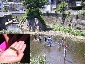 今年も岩崎小学校の児童達と検査および川遊びを行った。4回目になり、初年度のこども達は高校生になっているかと時の経つのは早いもの。昨年は参加できなかったが、年々参加する児童が多くなった。ただ初年度のこども達の方がよく水性動物のことを知っていた。2年目は鯉を捕まえた子もいたが、今年はまったくダメだった。しょうがなくて私が小魚を捕まえた。どうしてあんな速く泳ぐのを捕まえられるのかと感心され、捕り方を教えようとしたところ時間となり「来年」といことになった。捕まえた魚は学校で飼うということで、名前を調べるように渡した。 |