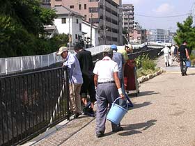 今年の暑さは異常で、松並木プロムナードの松が悲鳴をあげているということで、会員に出動依頼がかかった。平日であるためサラリーマンはこれないが、というか居ないかと思ったが、予想以上の人が集まった。保土ヶ谷町自治会のエンジンポンプで今井川から水を汲み上げる予定であったが、1年以上使用していないため、エンジンがなかなかかからない。 30分以上、入れ替わり立ち代りこころみてようやく動作した。もし動かなかったら、人間達の方は参っていた。あとは人力で花壇へバケツリレーでなんとか300mの水まきが完了。 年金生活者は飲み会になったが、事業主達は月曜日でまだ12時だし飲むわけにはということで解散。かなりな重労働であった。 バス停で待っていた、糞婆が「あんあた達、ボランティア、もの好きねぇ」と言ったそうで、もの好きには違いないが、私が居たら写真撮って、晒し者したのだが・・・ |