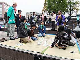 保土ヶ谷区役所から「市民活動団体に協力いただき、区のPRを行うので、かるた大会」をやって欲しいということで、大判かるたを持って、市営地下鉄センター南(地上3階だが)へ行き、かるた大会を行った。都合8回1人で読み上げたので、声をからした。一人では厳しかった。 青年男女でチーム戦をやりたいという申し出があり、男女3対3で行った。役札を設けたため、取り札が多い方が勝とは限らないのが結構受けた。賞品が「ほどじゃが焼酎」だったらもっと盛り上がっただろう。 この対戦を見ていたこども達は次は自分もやりたいと言い出し、中には字が読めない小さ過ぎる子もいて、保土ヶ谷区民祭りより盛況だった。 |