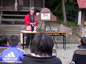 松並木愛護会の活動の一貫で、「ほどがやえかたり~べ」の能村さんに外川神社にまつわる伝説と、川島町につたわる大蛇を題材にした紙芝居を行った。こども達もわりと集まり、区内では初演ということでまだ2話しかないそうだが、区内には50以上あるとのことで、今後充実すると思われる。 外川神社は明治2年に勧請されといわれ、「紙芝居の枕ではこの外川神社は別の所にあった」と言っていたので間違いはなさそうであるが、別の場所とはどこだろう? また話の中で「ちゃんばら遊び」が出てきて「みんな知っているかなぁ」と言ったが、実演すべきだと思った。鬼ごっこも同様だろう。 |