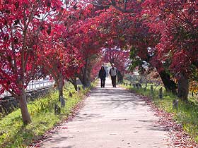 浮羽高校山岳部(すでに廃部、高校の名称も変わってしまった)の我々の年代の卒業写真(当時の1,2年も対象)に「当時の3年生が還暦の年になり、写っているものは全員、万難を排して集合」ということで、中学、高校の同窓会には参加したこはなかったが、それこそ「万難を排して」帰省した。昔は国道210号の沿道は民家もまばらでほとんど田んぼだったが、現在は切れ間がなくなっている。沿道から垂直に耳納山へ行く道はどこもハゼの木の並木で、当時は珍しくもなかった。 現在はほとんど切られて、唯一この「延寿寺(えんじゅうじ)曽根の櫨並木」だけになり、当時の木はわずかだが、若木が植えられ、写真のように紅葉が盛りだった。 |