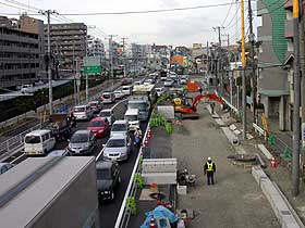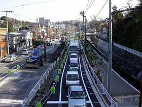 国道1号の拡張工事でプロムナード側の車道が開通した。箱根駅伝になんとか間に合ったというか合わせた、保土ヶ谷土木の面目躍如と言ったところ。完全に工事が完了するのは3月末ということだ。ただし、心配ごとがないわけではない。岩崎ガード(撮影地点)から東京寄りの花壇部分は直接車道に面しているため観客が踏みつけそうだ。 |
