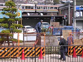 松並木愛護会の要望で、横浜市が上方見附と常夜燈を設置されることになっていて本日見附が姿を表した。見附とは宿場の入口を示す境界というか仕切りを示す土居のようなもの。現在は赤坂見附という駅名が残っているが、この見附は江戸城のもので、砦のようなもの。保土ヶ谷宿には江戸方見附(天王町の橘花神社と松原商店街入口の中間あたり)とこの上方見附(実際はもっと岩崎ガード寄りにあったと推測)があり、この間を宿内と言った。大名行列は宿内で行われ、外へ出ると結構、自由に歩いていたという。薩摩など江戸から遠方の大名なんか千数百kmを「下に下に・・・」なんかやってられないのは自明。 4月初めに、常夜灯・上方見附完成オープニングイベントが行われる。 |