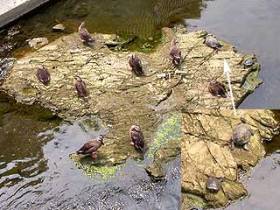 完成したわけではないがプロムナードが通れるようになり、保土ヶ谷宿の上方見附があった付近の今井川で写真の光景を目にした。今年、生まれたカルガモも親鳥と見分けがつかないようになっており、今日は全部そろっているなとよく見るとカメが二匹いた。このカメは在来種ではなく、ミシシッピーアカミミガメらしい。誰かが離したものが育ったもので、7月末に水質調査で入った時、子ガメも確認している。本日はコサギは未確認。 なおカルガモは写真に写っていないものも含めると14匹を確認。 |