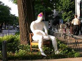 日本大通に何時も出ているわけではない。天気が良い日には出ていて、たぶん三井物産ビルの1Fにある GALLERY PARIS の所属だろう。雨の日はビルの中に居ることもあが、定位置ではない。立つと2m程度の大きい人だがロダンの考える人ほどではない(立つと3m程度の巨人)。 このオブジェの正式名称は知らないが、こどもの頃のTVドラマのミラーマンを思い出す。 |