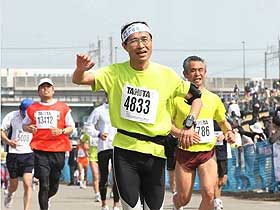 湘南マラソンに参加するつもりだったが、30kmと中途半端で、スタート/ゴールが大磯(去年は江の島)と、余計な交通費も嵩むので(主催者の魂胆がみえみえで、参加費も8000円と高い)、佐藤さん宅に泊まり、夫婦(さらに友達2人)と積山さんの6名で走った。記録は4:25:04とベストを出せたが、今回がもっともバテてしまい、走った後のダメージも最大だった。疲れきって保土ヶ谷を寝過ごしてしまった。 昨年と違い風もなく、暖かく、前半は調子がよかったが15km付近で佐藤さんに置いて行かれ、ハーフ地点では4分差。積山さんは4分遅れでスタートしたため会えず。16km地点では保土ヶ谷区役所の赤坂さん親子の応援で元気づけられた。 30kmまでに積山さんに追い抜かれたようで、35kmまでに抜き返したようだ。37kmで佐藤さんに追いつき、39kmで積山さんが追いついて来て41kmまでは3人で走る。ラスト1kmでダッシュ、積山、横溝、佐藤の順でゴール。 4回目で甘くみたようで、毎回新しいチャレンジで望むべきと反省しきり。あの宗男さんははるか彼方だ。 |