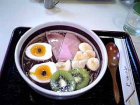 スープがコーヒーで、麺にもコーヒーが入っている。味がまったく想像できない。お花茶屋合宿所の近所に存在することが分かり土曜日(早めに仕事を上げる)でもあり、勇気を出して食べてみた。「ホットとアイスがありますが」と言われ、ホットにした。冷やし中華+アイスコーヒーだろうが、バニラアイスが乗っているという。待つことしばし、頼んだブツが出てきた。茹でタマゴ、ハムは普通のラーメンと同じであるが、キューイとバナナが乗っているのだ。好みでスープにミルクを入れて飲む仕掛けは笑えた。 腹がへっていたので何とか食えたが、日を変えてアイスコーヒーラーメンに挑戦する気はない。 オーナーに何でコーヒー+ラーメンを発想したのかと聞いたところ、店(喫茶店かカラオケ屋か不明な店)の特徴を出そうと、もともとコーヒーには凝っているので、ラーメンにしたとか、特許も取っているそうであるが、誰も真似はしないと思うので、特許を取るには100万近くかかたであろう。無駄だったような気がするが・・・ |