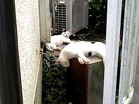 本日、観測史上、国内記録(40.9℃)を達成したとのこと。このような記録は嬉しくないし、さらに更新されるのではないだろうか。家内が入院している病院からの帰り「もうどうにでもしてくれ~」状態のニャンコを見かけた。立ち止まりカメラを向けたら1匹首を上げたが、このあと元通りドテッと寝転んだ。手前の方は血が頭にいってヤバいのではないだろうか。人間に限らず動物にも厳しい夏だ。長期の天気予報では冷夏と言っていたように思うのだが、トレーニングもやる気になれない。しかし、この酷暑の中、病院の前でジョギングしている同年代の人を見たが、真似する気は起こらなかった。 |